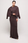 Sportowy komplet w ciepłym odcieniu brązu, który łączy codzienną wygodę z wyrafinowaną kobiecością. Ocieplana, sportowa marynarka z długim rękawem i klasyczny t-shirt w dopasowanym tonie tworzą harmonijną bazę, a dopasowana, bawełniana spódnica pięknie podkreśla talię, biodra i cały zarys sylwetki, nadając figurze kształt odwróconego kielicha. Choć uszyty z miękkich, casualowych materiałów, komplet prezentuje się wyjątkowo elegancko – doskonały zarówno do wygodnych trampek, jak i w połączeniu ze szpilkami, kiedy chcesz połączyć sportowy luz z kobiecym szykiem.