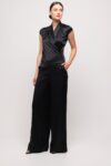 A silk ensemble in deep black, captivating with its fusion of classic style and subtle lustre. The short-sleeved wrap-front shirt with a delicate collar highlights the outfit’s refined, feminine character. Black silk trousers with a lustrous texture, fitted at the hips and flowing wide through the leg, lend the silhouette both lightness and sophisticated chic. An ideal choice for evening outings or elegant gatherings where comfort and timeless style are key.