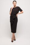 An elegant set in a deep chocolate hue impresses with its minimalist design, highlighted by a sophisticated side bow. The simple short-sleeved top combined with a fitted midi skirt creates a look that is both timeless and strikingly feminine. A perfect choice for both special occasions and stylish business meetings.