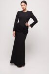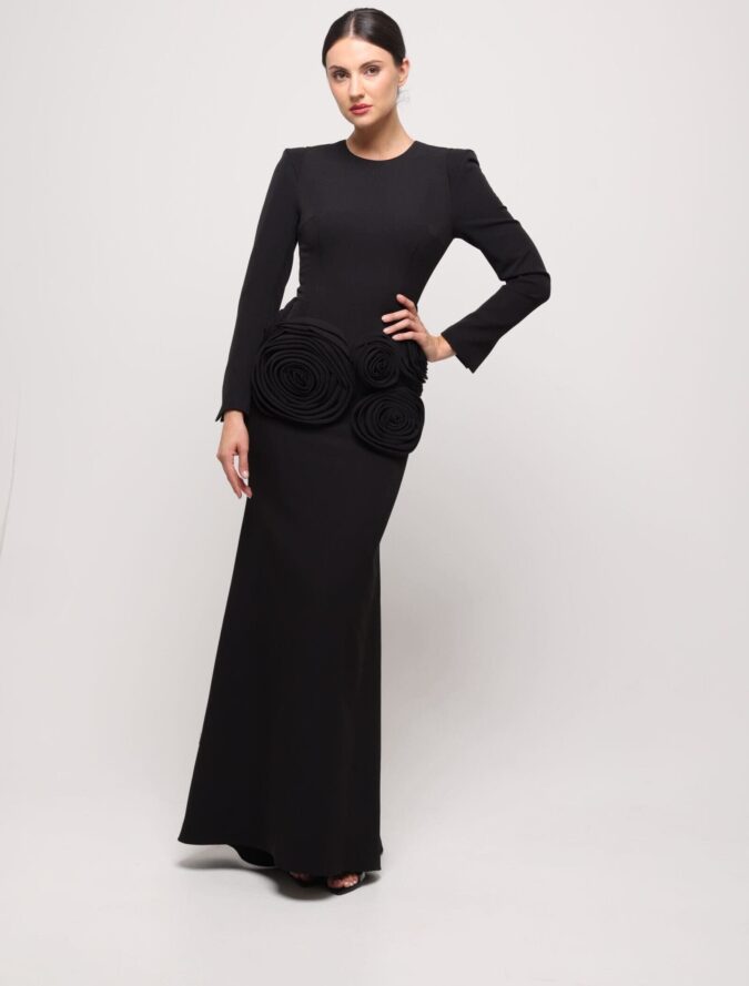 A long black dress that combines classic elegance with a subtle feminine accent. Fitted at the waist and hips, it flows softly from mid-thigh, creating a sleek, harmonious line. The low neckline and long sleeves underscore its timeless, business-like character, while four roses of varying sizes, placed at hip level, add refined, artistic charm. An ideal choice for formal receptions and special occasions where both sophistication and unique detailing matter.