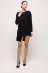 A short black dress in a modern interpretation impresses with its minimalist design and subtle, asymmetrical finish. The simple cut, featuring long sleeves and a short wrap-style hemline, accentuates the legs and lends the look a light, sensual character. A timeless option, perfect for both elegant evenings out and stylish cocktail gatherings.