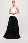A spectacular dress in black and white exuding both dramatic flair and classic elegance. The pure white bodice beautifully emphasizes the shoulders, while the flared full-length skirt flows seamlessly into the top, creating a harmonious silhouette. At the front, a striking cutout reveals black fabric adorned with lavish, three-dimensional roses, adding an artistic touch to the creation. The gown extends to the floor and gently trails behind, ensuring a breathtaking entrance on every special occasion.