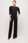 This elegant black set blends classic style with a subtle floral detail. The straight tailored trousers flatter the waist and hips, while their timeless cut gives the silhouette a sleek finish. The cropped blouse with three-quarter sleeves and a classic low round neckline captivates with its exceptional detailing – the fabric is shaped into elegant, sculpted roses on the shoulders. A look that combines minimalist design with feminine finesse, perfect for special occasions.