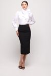 A classic set with a timeless appeal – a white blouse featuring a striking wide bow at the neck paired with a fitted black midi skirt. The blouse, with its subtle sheen and lightly puffed sleeves, beautifully frames the neck and shoulders, while the pencil skirt highlights the feminine silhouette and lends the ensemble an elegant finish. An ideal choice for business meetings, sophisticated receptions, or any occasion where class and refined style matter.