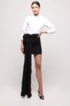 A modern take on classic style – a perfectly tailored white shirt paired with a black mini skirt adorned with an impressive bow featuring a long, softly draping panel. The bold color contrast and sculptural form of the bow create an effect of pure sophistication and contemporary elegance. An ideal choice for evening outings, artistic events, or special occasions when you want to combine a minimalist base with a striking detail.