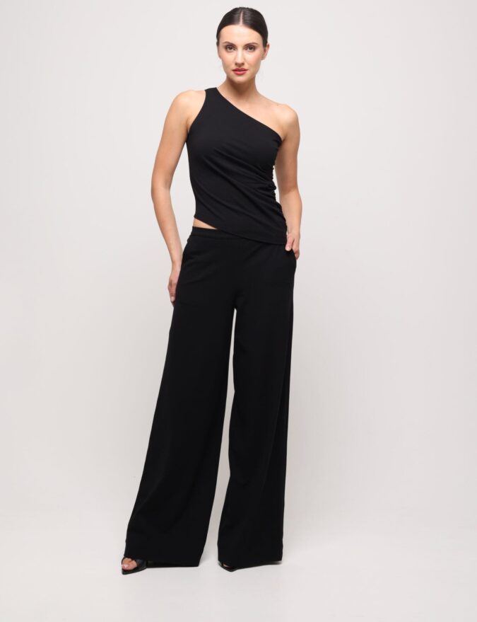 A sporty ensemble in timeless black that combines casual ease with refined style. The one-shoulder tank top, subtly ruched at the waist, highlights the figure, while the long wide-leg trousers lend lightness and a modern edge. Though crafted from soft cotton jersey, the set surprises with its elegant, feminine effect. Perfect with casual sneakers for everyday wear or with heels for a casual-evening look infused with a touch of luxury.