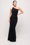 A sporty set in classic black that impresses with its feminine shape and elegant character. The one-shoulder tank top, subtly gathered at the waist, pairs beautifully with the fitted cotton skirt, which accentuates the waist, hips, and the full silhouette to create a tulip-like effect. Though made from soft cotton, this ensemble exudes remarkable chic—ideal with casual sneakers or paired with heels when you want to combine comfort with refined elegance.