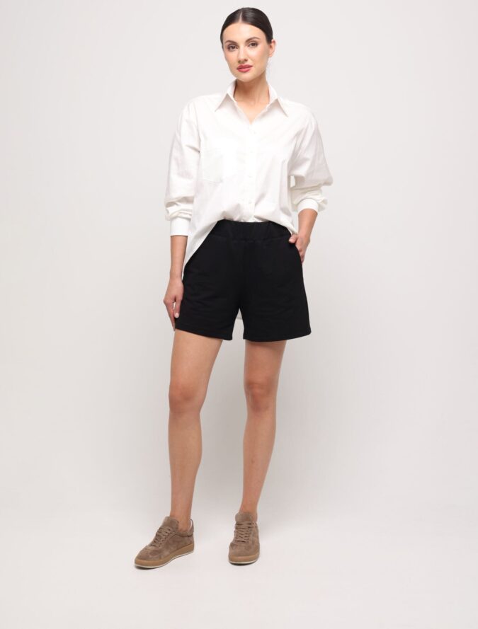 A classic set in a minimalist style that fuses sporty comfort with timeless elegance. The simple white collared shirt in a relaxed cut pairs perfectly with black cotton mid-thigh shorts featuring practical pockets. Made from natural, soft fabrics, the set looks fresh and feminine—ideal with sneakers for an everyday look or styled with elegant accessories when you want a light yet polished outfit.