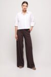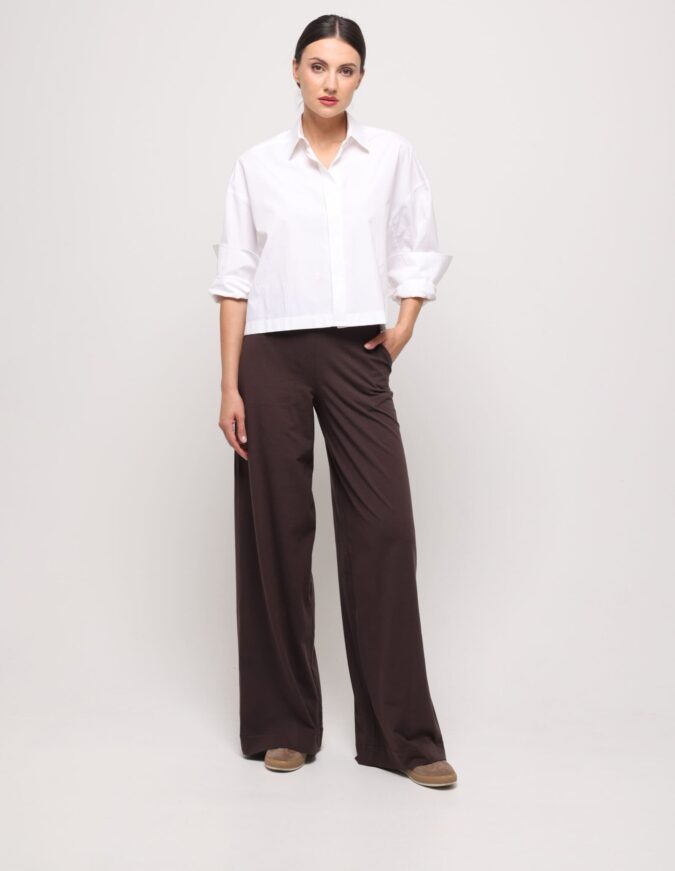A timeless ensemble crafted from soft cotton, where everyday ease meets subtle elegance. The classic white collared shirt in a simple, relaxed cut provides the perfect base, while the long wide-leg trousers lend a touch of modern lightness. Though made from natural, casual fabric, the set looks exceptionally feminine and polished—ideal with comfortable sneakers or paired with heels when you want to combine sporty ease with refined style.
