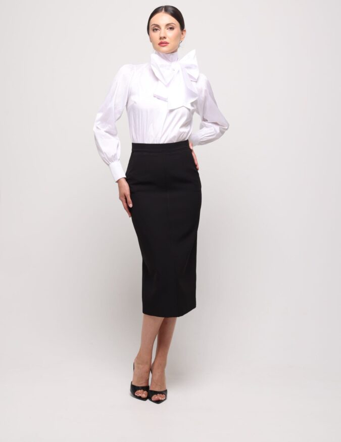 Klasyczny komplet w ponadczasowym wydaniu – biała koszula z efektowną, szeroką kokardą przy szyi w duecie z dopasowaną, czarną spódnicą o długości midi. Koszula z subtelnym połyskiem i lekko bufowanymi rękawami pięknie podkreśla szyję oraz ramiona, a spódnica o ołówkowym kroju eksponuje kobiecą sylwetkę i dodaje całości elegancji. Idealny wybór na spotkania biznesowe, eleganckie przyjęcia czy wyjątkowe okazje, kiedy liczy się klasa i wyrafinowany styl.