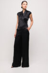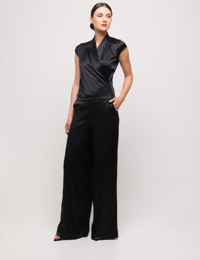 Jedwabny komplet w głębokiej czerni zachwycający połączeniem klasyki i subtelnego blasku. Koszulka „na zakładkę” z krótkim rękawem i delikatnym kołnierzykiem podkreśla elegancki, kobiecy charakter stylizacji. Czarne, jedwabne spodnie o lśniącej fakturze, dopasowane w biodrach i szerokie na całej długości, nadają sylwetce lekkości i wyrafinowanego szyku. To idealny wybór na wieczorne wyjścia lub eleganckie spotkania, gdzie liczy się komfort i ponadczasowy styl.