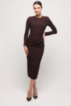 Elegancka sukienka midi w głębokim odcieniu czekoladowego brązu zachwyca minimalistycznym fasonem i subtelnymi drapowaniami podkreślającymi kobiecą sylwetkę. Długie rękawy i dopasowany krój nadają jej wyrafinowanego charakteru, idealnego zarówno na oficjalne przyjęcia, jak i wieczorne wyjścia. Wykonana z wysokiej jakości, elastycznej tkaniny, zapewnia komfort noszenia i doskonałe dopasowanie. To klasyka w nowoczesnym wydaniu, która dodaje pewności siebie i ponadczasowego szyku.
