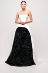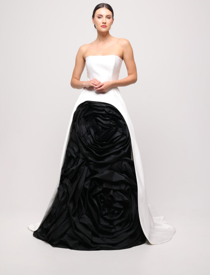 Spektakularna suknia w biało-czarnym zestawieniu emanująca dramatyczną, a zarazem klasyczną elegancją. Gorset w czystej bieli pięknie podkreśla linię ramion, a rozkloszowany, długi dół płynnie łączy się z górą, tworząc harmonijną całość. Z przodu uwagę przyciąga efektowne wycięcie wypełnione czarnym materiałem ozdobionym okazałymi, trójwymiarowymi różami, które dodają kreacji artystycznego charakteru. Suknia sięga ziemi i delikatnie po niej ciągnie, zapewniając zjawiskowy efekt podczas każdego wyjątkowego wejścia.