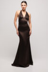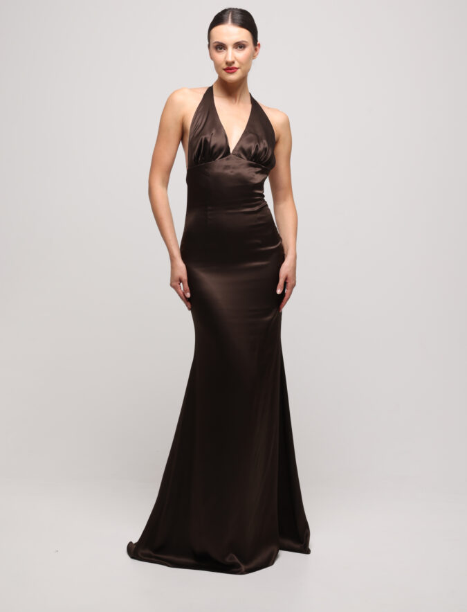 Jedwabna suknia w odcieniu głębokiego, ciepłego brązu, zachwycająca subtelnym, naturalnym połyskiem. Zmysłowy krój odsłania plecy, a wiązanie na szyi dodaje całości lekkiej, klasycznej elegancji. Dopasowana w talii i biodrach, od kolan miękko rozchodzi się ku dołowi, tworząc długą, zwiewną linię z trenem. Lejąca, delikatna i pełna kobiecego uroku – idealna na wieczorne przyjęcia i wyjątkowe okazje, kiedy chcesz olśniewać ponadczasowym stylem.