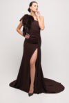 Zmysłowa suknia w ciepłym odcieniu brązu, wykonana z lekkiej, zwiewnej organzy. Asymetryczny krój na jedno ramię podkreśla linię dekoltu, a dopasowanie w biuście i talii subtelnie modeluje sylwetkę. Od bioder materiał miękko spływa ku ziemi, tworząc delikatną, powiewającą linię z lekkim trenem. Marszczenia w talii dodają finezji, a dopełnieniem całości jest niewielkie futerko z naturalnych norek w idealnie dopasowanym odcieniu brązu – luksusowy akcent, który podkreśla wieczorowy charakter kreacji.