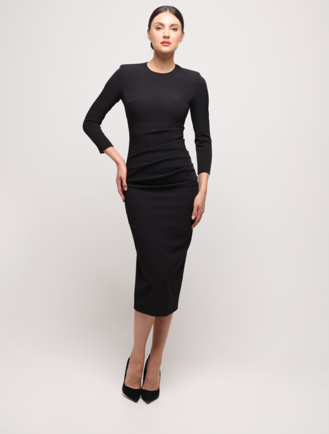 Ta dopasowana czarna sukienka midi to kwintesencja klasycznej, biznesowej elegancji. Subtelnie podkreśla talię i biodra, a delikatne marszczenia na lewym biodrze i w talii dodają jej wyjątkowego, kobiecego charakteru. Niski, okrągły dekolt wprowadza nutę ponadczasowej prostoty, idealnie równoważąc szykowny fason. To idealny wybór na spotkania biznesowe, formalne przyjęcia i każdą okazję wymagającą nienagannego stylu.