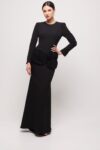Długa, czarna suknia łącząca klasyczną elegancję z subtelnym, kobiecym akcentem. Dopasowana w talii i biodrach, od połowy ud miękko opływa sylwetkę, tworząc efekt smukłej, harmonijnej linii. Niski dekolt i długie rękawy podkreślają ponadczasowy, biznesowy charakter kreacji, a cztery róże o różnych wielkościach, umiejscowione na wysokości bioder, dodają jej wyrafinowanego, artystycznego uroku. To idealny wybór na formalne przyjęcia i wyjątkowe spotkania, gdzie liczy się klasa i niepowtarzalny detal.