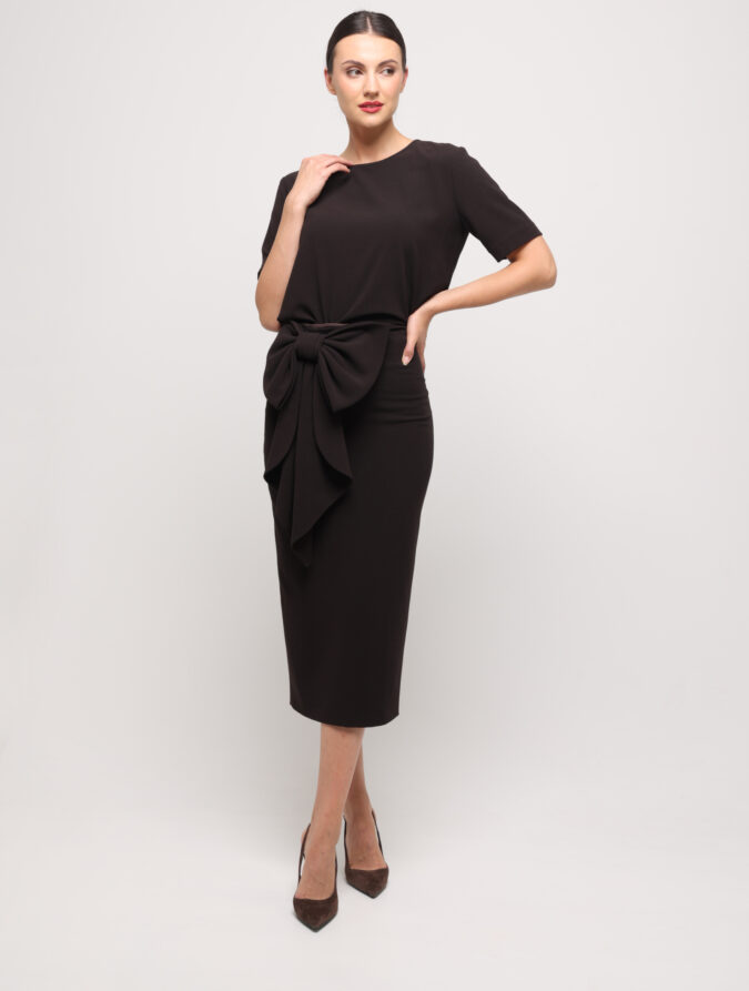 Elegancki komplet w odcieniu głębokiej czekolady zachwyca minimalistyczną formą, którą podkreśla wyrafinowana kokarda dopinana z boku. Prosta góra z krótkim rękawem w połączeniu z dopasowaną spódnicą midi tworzy ponadczasową i niezwykle kobiecą sylwetkę. To propozycja idealna zarówno na wyjątkowe okazje, jak i stylowe spotkania biznesowe.
