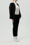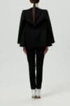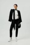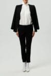 Elegancki garnitur damski wykonany z włoskiej wełny. Żakiet bez zapięcia, na wiskozowej podszewce, z prostymi rękawami zakończonymi rozcięciami. Spodnie o prostym kroju, dopasowane w talii, z szlufkami na pasek i dyskretnym zapięciem. Całość tworzy ponadczasowy komplet, idealny zarówno do pracy, jak i na formalne okazje. Garnitur możliwy do uszycia w różnych kolorach.