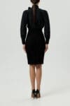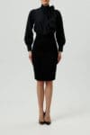 Wyjątkowy komplet składający się z dopasowanego żakietu i ołówkowej spódnicy, wykonanych z wełny. Konstrukcja żakietu podkreśla talię i ramiona, a ozdobne guziki dodają mu wyrafinowanego charakteru. Uzupełnieniem zestawu jest efektowna koszula Blanche z jedwabnej tafty, wiązana pod szyją w dekoracyjną kokardę — element, który dodaje całości szyku i ponadczasowego wdzięku. Komplet w głębokiej czerni doskonale sprawdzi się zarówno na wyjątkowe okazje, jak i spotkania biznesowe.