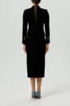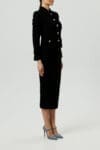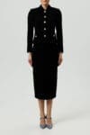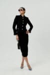 Elegancki komplet składający się z dopasowanego żakietu i spódnicy o długości midi, wykonany z wełny. Taliowany żakiet z kołnierzem został ozdobiony efektownymi, biżuteryjnymi guzikami, które nadają całości szykownego charakteru. Spódnica o prostym kroju subtelnie podkreśla sylwetkę, tworząc ponadczasowy i profesjonalny look. Ten zestaw to idealna propozycja dla kobiet ceniących klasę, minimalizm i wyrafinowane detale.