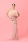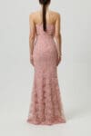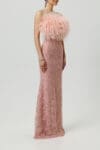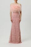 Komplet składający się z topu oraz długiej spódnicy w delikatnym odcieniu pudrowego różu. Top, zapinany na zamek, zdobiony naturalnymi piórami, które nadają mu wyjątkowego charakteru. Spódnica o wysokim stanie perfekcyjnie podkreśla sylwetkę, a jej długość zdobi koronkowa aplikacja w kwiatowy wzór. Całość łączy klasyczną elegancję z nowoczesnym stylem.