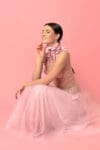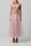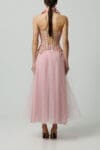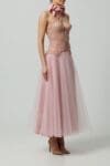 Zmysłowy gorset na fiszbinach o oryginalnym kroju, z tylnym wiązaniem i koronkowymi detalami w duecie z tiulową spódnicą w kolorze pudrowego różu. Kwiatowe detale i perfekcyjny krój podkreślają talię i dodają kreacji bajkowego uroku.