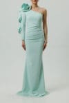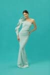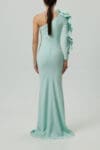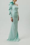 Asymetryczna suknia wieczorowa w pięknym pistacjowym odcieniu, z efektownym, pojedynczym rękawem zakończonym aplikacją przypominającą kwiat. Dopasowany krój pięknie podkreśla talię, a lekko marszczony materiał zmysłowo układa się na sylwetce. To propozycja dla kobiet ceniących sobie elegancję z artystycznym akcentem.
