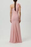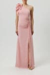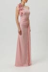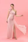 Długa suknia wieczorowa w kolorze pudrowego różu, o dopasowanej linii i kobiecej formie. Asymetryczna góra na jedno ramię ozdobiona dopinaną aplikacją z kwiatów. Delikatne marszczenia w talii wysmuklają sylwetkę, a głębokie rozcięcie na lewej nodze dodaje kreacji zmysłowego charakteru.