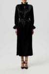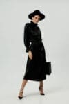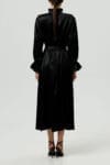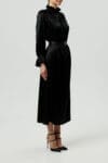 Elegancka, satynowa sukienka o długości midi z delikatnym połyskiem. Góra wykończona stójką z romantyczną falbaną i ozdobnym wiązaniem przy szyi. Rękawy długie, zakończone szerokim mankietem z falbaną. Talia podkreślona paskiem, który modeluje sylwetkę. Idealna na wieczorne wyjścia, przyjęcia czy eleganckie spotkania.