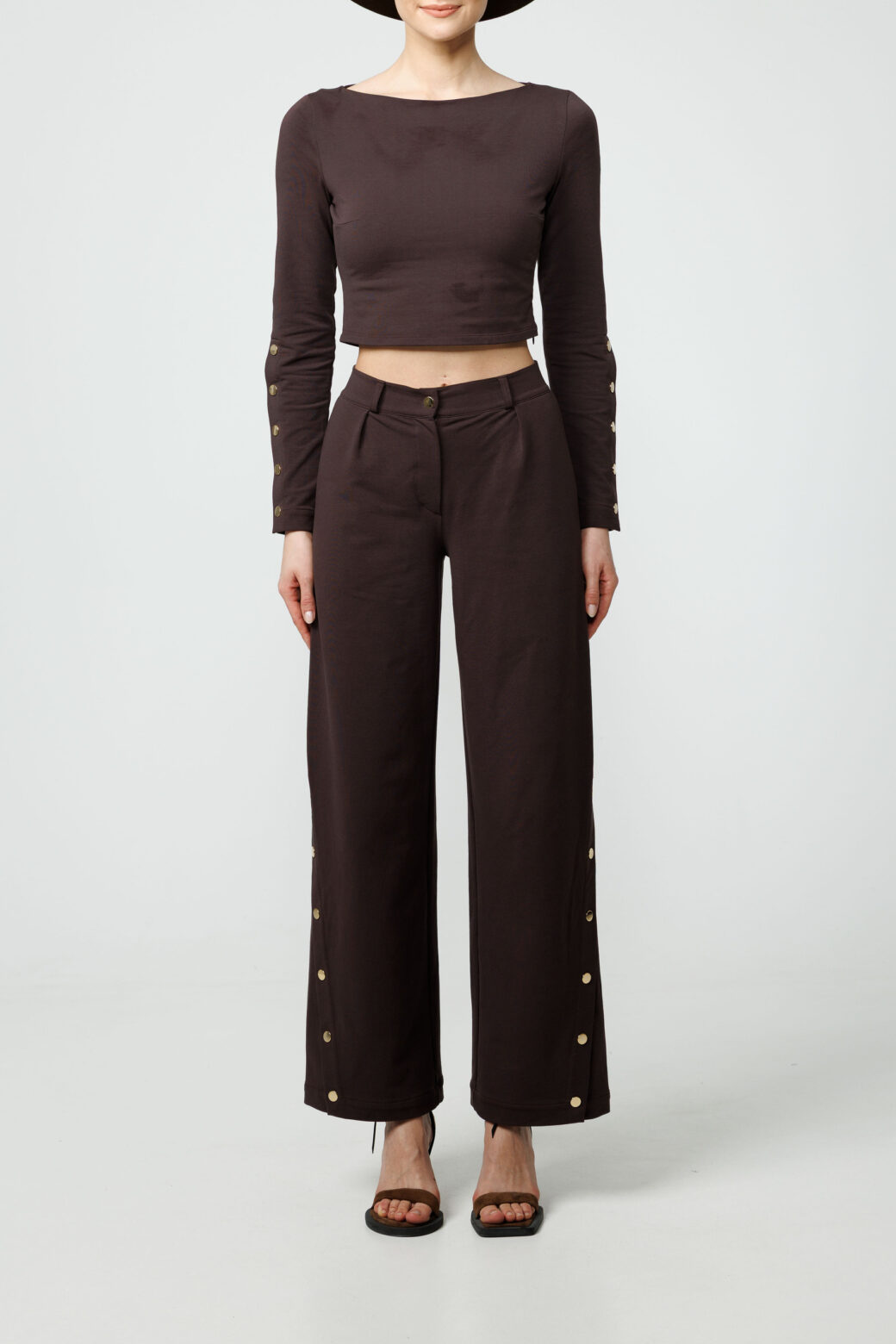 Bluza w formie krótkiego topu z długim rękawem i szerokim dekoltem typu łódka. Rękawy wykończone są rzędem złotych nap, które pełnią funkcję ozdobną.