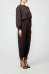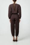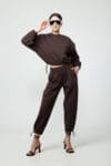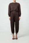 Spodnie szyte z grubej, mięsistej bawełny. Model wyróżnia się pionowym, dekoracyjnym przeszyciem wzdłuż nogawek oraz marszczonym pasem na gumce. Nogawki zakończone są tunelowym ściągaczem z troczkami, które można dowolnie regulować.